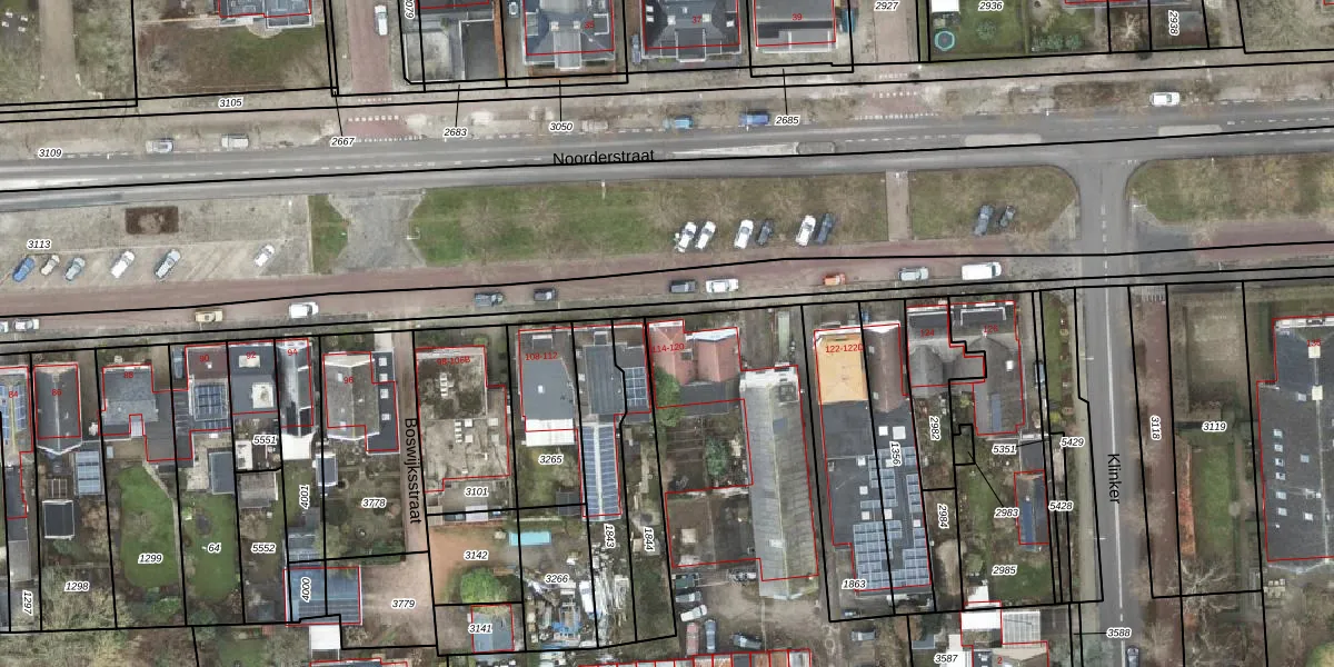Het perceel waarop Noorderstraat 114 staat heeft een oppervlakte van 3091 m². Dit is een zeer groot perceel. De perceeloppervlakte wordt geregistreerd door het Kadaster. Gedetailleerde informatie over de maten van dit perceel kunt u vinden in het rapport Kadastrale kaart met maatvoering van Noorderstraat 114.