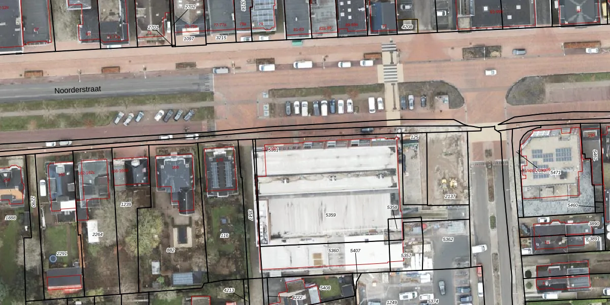 Het perceel waarop Noorderstraat 180 staat heeft een oppervlakte van 1767 m². Dit is een zeer groot perceel. De perceeloppervlakte wordt geregistreerd door het Kadaster. Gedetailleerde informatie over de maten van dit perceel kunt u vinden in het rapport Kadastrale kaart met maatvoering van Noorderstraat 180.