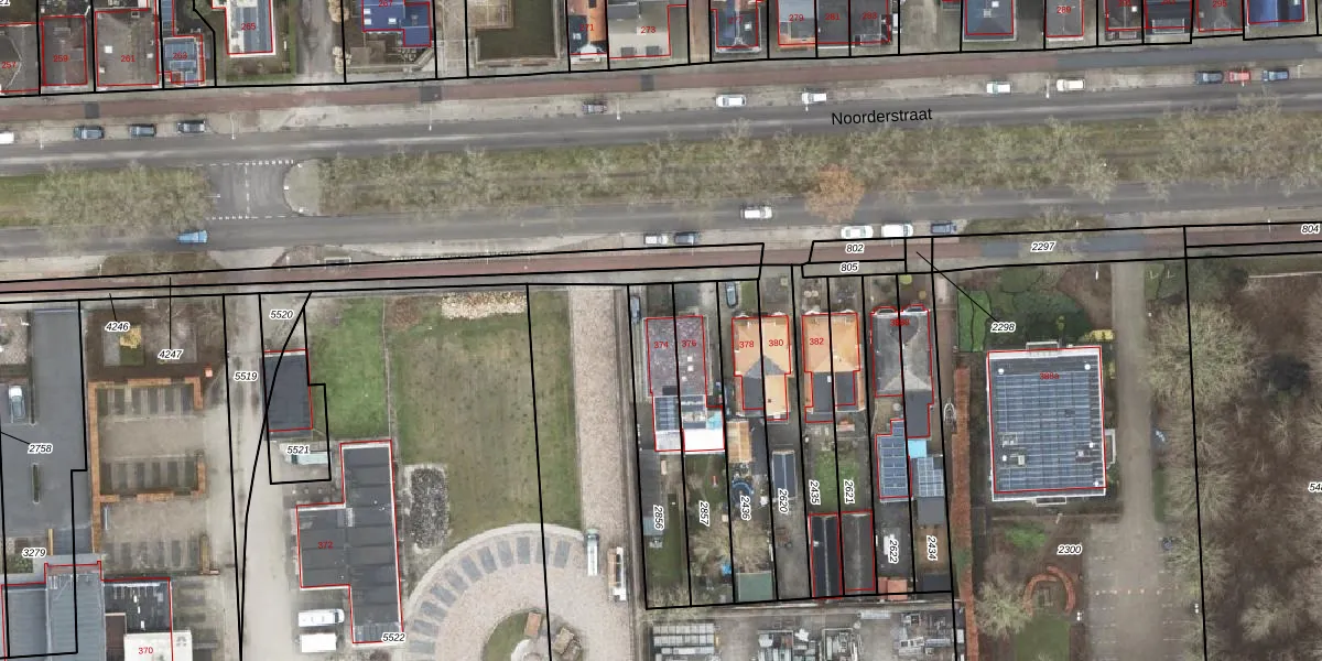 Noorderstraat 374 is gelegen op kadastraal perceel SPM00G2856. Deze kadastrale aanduiding is uniek en wordt gebruikt door het Kadaster om eigendomsrechten en andere zakelijke rechten vast te leggen. Het perceel maakt onderdeel uit van de kadastrale gemeente Sappemeer.