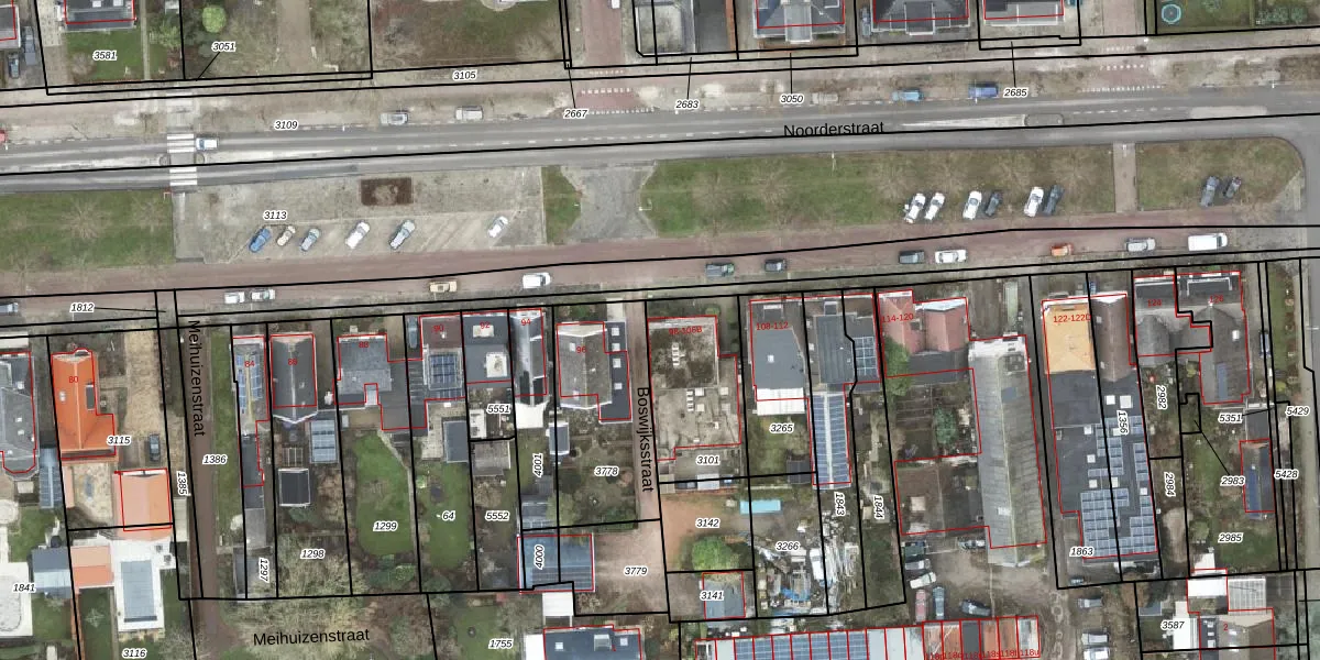 Het perceel waarop Noorderstraat 98 staat heeft een oppervlakte van 381 m². Dit is een groot perceel. De perceeloppervlakte wordt geregistreerd door het Kadaster. Gedetailleerde informatie over de maten van dit perceel kunt u vinden in het rapport Kadastrale kaart met maatvoering van Noorderstraat 98.