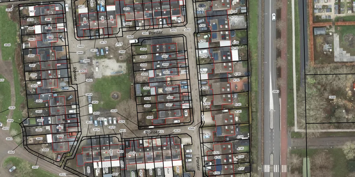 Het perceel waarop Ponser 39 staat heeft een oppervlakte van 213 m². Dit is een middelgroot perceel. De perceeloppervlakte wordt geregistreerd door het Kadaster. Gedetailleerde informatie over de maten van dit perceel kunt u vinden in het rapport Kadastrale kaart met maatvoering van Ponser 39.