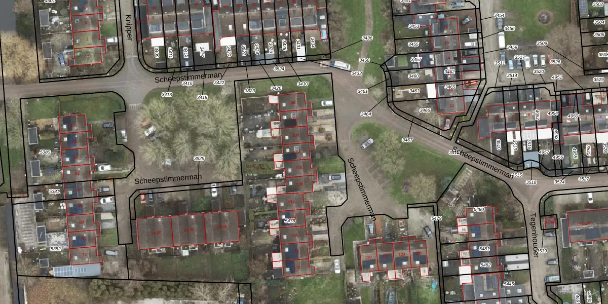 Het perceel waarop Scheepstimmerman 104 staat heeft een oppervlakte van 4602 m². Dit is een zeer groot perceel. De perceeloppervlakte wordt geregistreerd door het Kadaster. Gedetailleerde informatie over de maten van dit perceel kunt u vinden in het rapport Kadastrale kaart met maatvoering van Scheepstimmerman 104.
