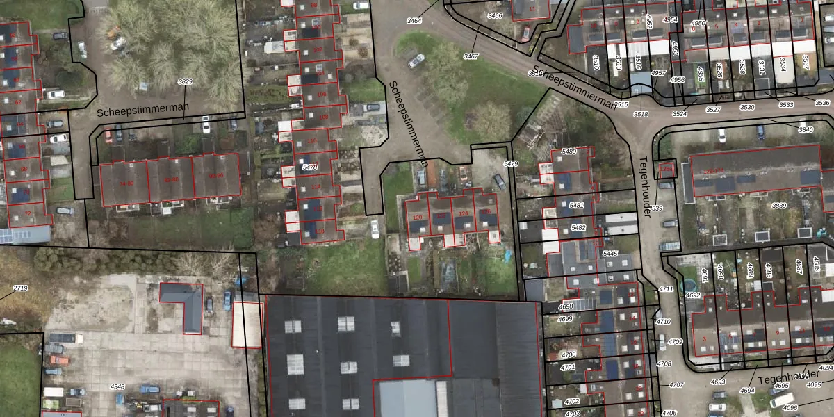 Het perceel waarop Scheepstimmerman 120 staat heeft een oppervlakte van 4602 m². Dit is een zeer groot perceel. De perceeloppervlakte wordt geregistreerd door het Kadaster. Gedetailleerde informatie over de maten van dit perceel kunt u vinden in het rapport Kadastrale kaart met maatvoering van Scheepstimmerman 120.