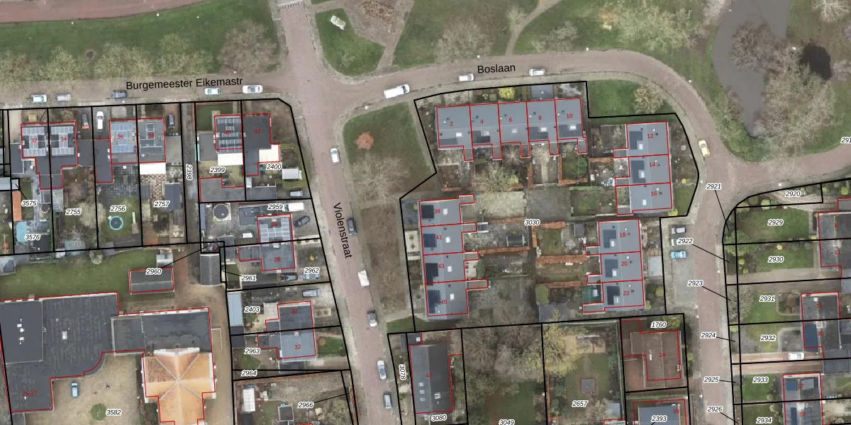 Het perceel waarop Violenstraat 39 staat heeft een oppervlakte van 3262 m². Dit is een zeer groot perceel. De perceeloppervlakte wordt geregistreerd door het Kadaster. Gedetailleerde informatie over de maten van dit perceel kunt u vinden in het rapport Kadastrale kaart met maatvoering van Violenstraat 39.