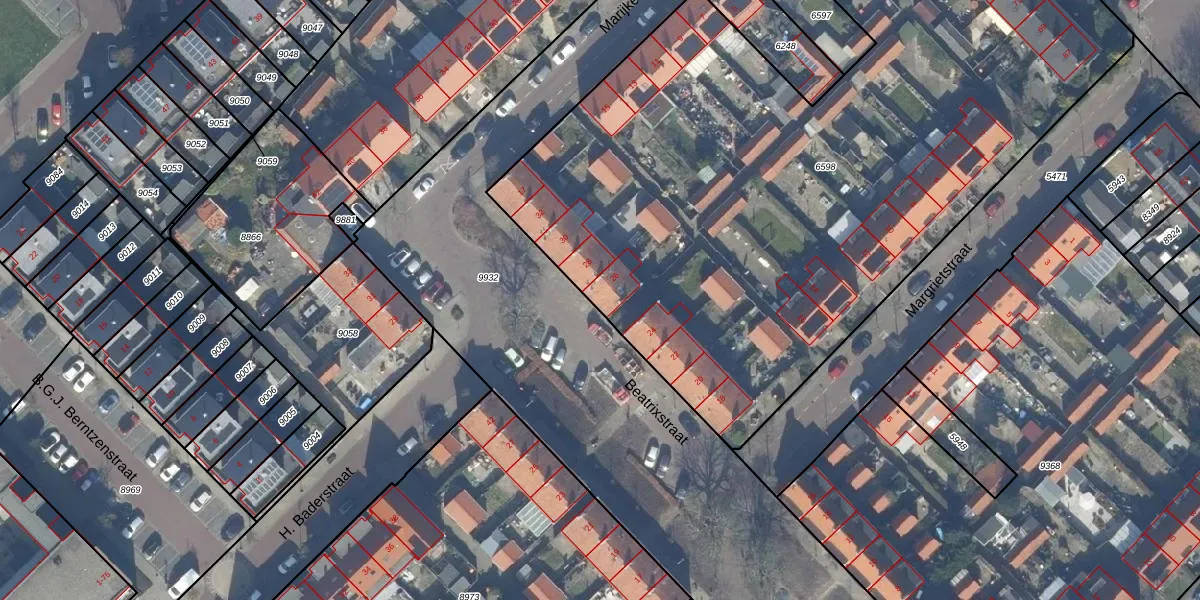 Het perceel waarop Beatrixstraat 26 staat heeft een oppervlakte van 5212 m². Dit is een zeer groot perceel. De perceeloppervlakte wordt geregistreerd door het Kadaster. Gedetailleerde informatie over de maten van dit perceel kunt u vinden in het rapport Kadastrale kaart met maatvoering van Beatrixstraat 26.