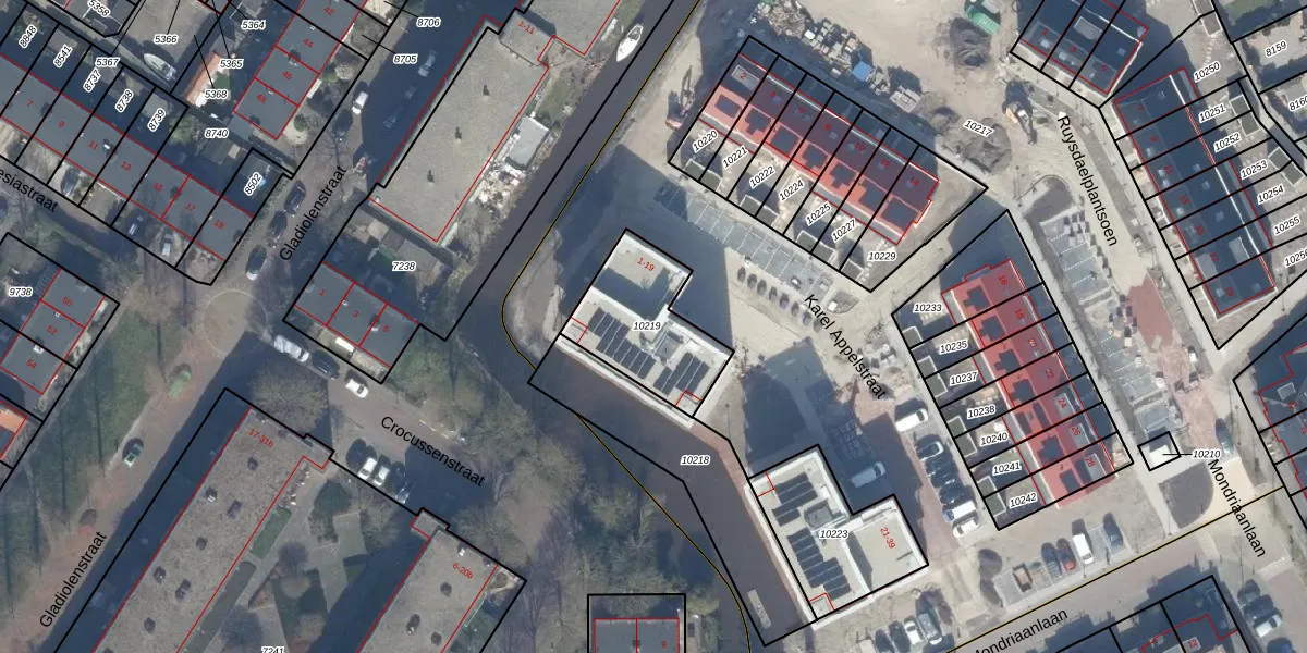 Het perceel waarop Karel Appelstraat 13 staat heeft een oppervlakte van 372 m². Dit is een groot perceel. De perceeloppervlakte wordt geregistreerd door het Kadaster. Gedetailleerde informatie over de maten van dit perceel kunt u vinden in het rapport Kadastrale kaart met maatvoering van Karel Appelstraat 13.