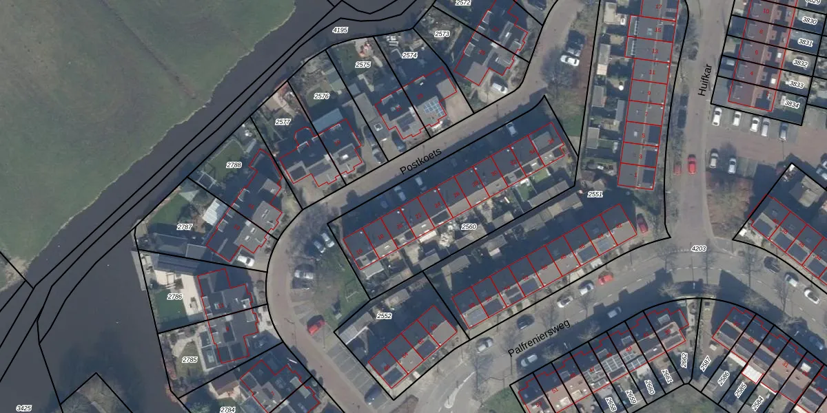 Het perceel waarop Postkoets 22 staat heeft een oppervlakte van 1280 m². Dit is een zeer groot perceel. De perceeloppervlakte wordt geregistreerd door het Kadaster. Gedetailleerde informatie over de maten van dit perceel kunt u vinden in het rapport Kadastrale kaart met maatvoering van Postkoets 22.