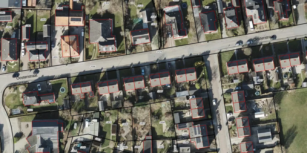 Het perceel waarop Oosterstraat 15 staat heeft een oppervlakte van 2655 m². Dit is een zeer groot perceel. De perceeloppervlakte wordt geregistreerd door het Kadaster. Gedetailleerde informatie over de maten van dit perceel kunt u vinden in het rapport Kadastrale kaart met maatvoering van Oosterstraat 15.