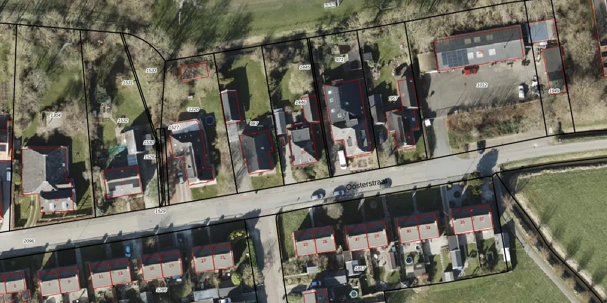 Het perceel waarop Oosterstraat 20 staat heeft een oppervlakte van 715 m². Dit is een groot perceel. De perceeloppervlakte wordt geregistreerd door het Kadaster. Gedetailleerde informatie over de maten van dit perceel kunt u vinden in het rapport Kadastrale kaart met maatvoering van Oosterstraat 20.
