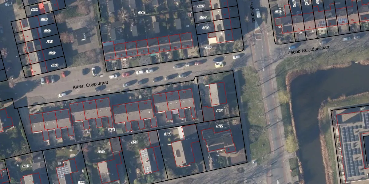 Het perceel waarop Albert Cuypstraat 24 staat heeft een oppervlakte van 2380 m². Dit is een zeer groot perceel. De perceeloppervlakte wordt geregistreerd door het Kadaster. Gedetailleerde informatie over de maten van dit perceel kunt u vinden in het rapport Kadastrale kaart met maatvoering van Albert Cuypstraat 24.