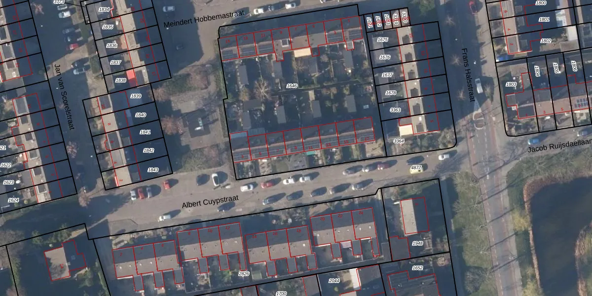 Het perceel waarop Albert Cuypstraat 9 staat heeft een oppervlakte van 2639 m². Dit is een zeer groot perceel. De perceeloppervlakte wordt geregistreerd door het Kadaster. Gedetailleerde informatie over de maten van dit perceel kunt u vinden in het rapport Kadastrale kaart met maatvoering van Albert Cuypstraat 9.