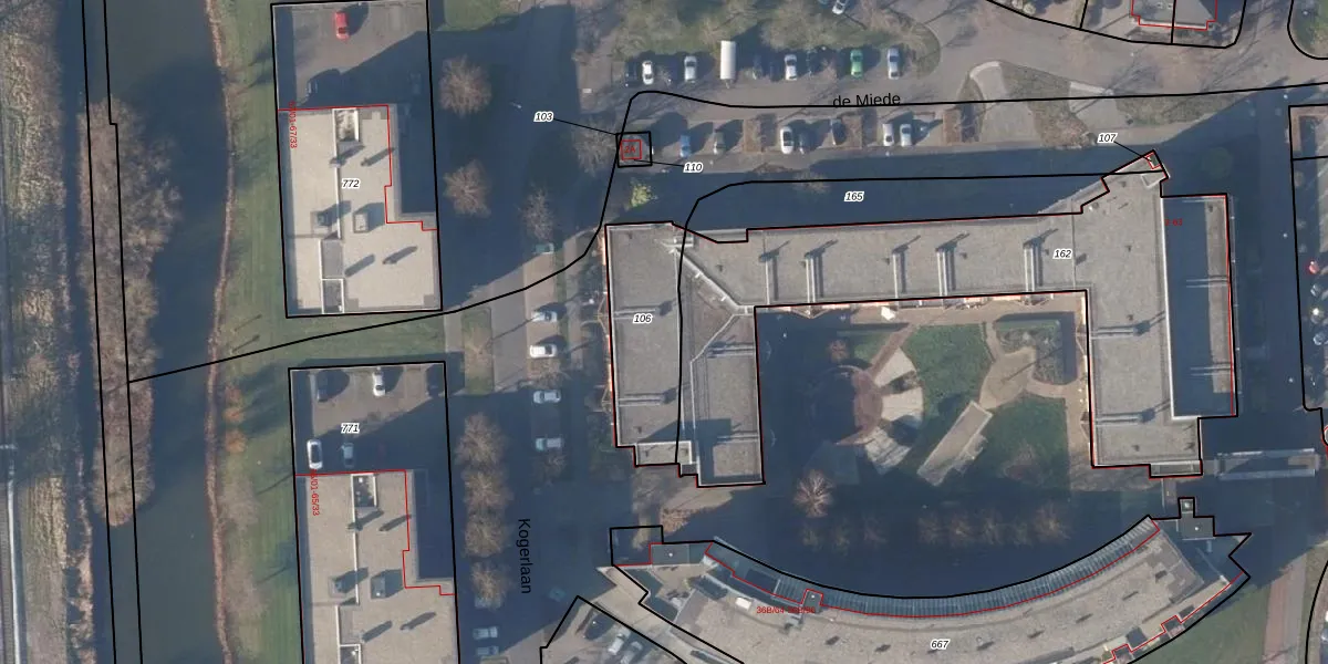 Het perceel waarop de Miede 24 staat heeft een oppervlakte van 370 m². Dit is een groot perceel. De perceeloppervlakte wordt geregistreerd door het Kadaster. Gedetailleerde informatie over de maten van dit perceel kunt u vinden in het rapport Kadastrale kaart met maatvoering van de Miede 24.