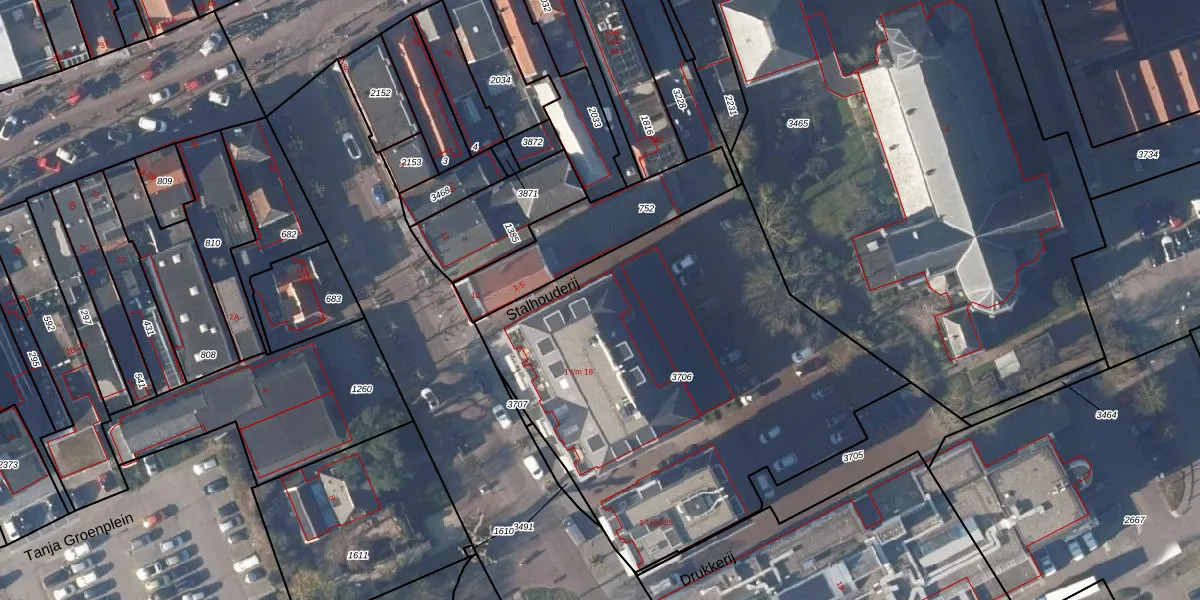Het perceel waarop Drukkerij 1 staat heeft een oppervlakte van 2412 m². Dit is een zeer groot perceel. De perceeloppervlakte wordt geregistreerd door het Kadaster. Gedetailleerde informatie over de maten van dit perceel kunt u vinden in het rapport Kadastrale kaart met maatvoering van Drukkerij 1.