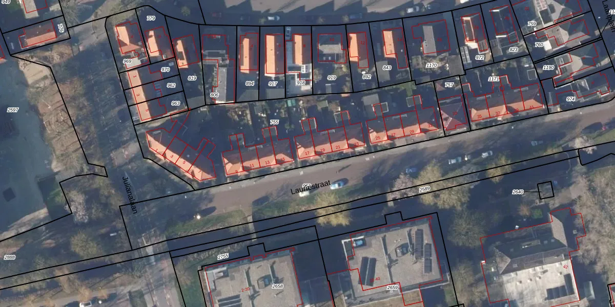 Het perceel waarop Lauriestraat 17 staat heeft een oppervlakte van 2145 m². Dit is een zeer groot perceel. De perceeloppervlakte wordt geregistreerd door het Kadaster. Gedetailleerde informatie over de maten van dit perceel kunt u vinden in het rapport Kadastrale kaart met maatvoering van Lauriestraat 17.