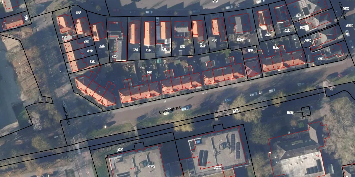 Het perceel waarop Lauriestraat 19 staat heeft een oppervlakte van 2145 m². Dit is een zeer groot perceel. De perceeloppervlakte wordt geregistreerd door het Kadaster. Gedetailleerde informatie over de maten van dit perceel kunt u vinden in het rapport Kadastrale kaart met maatvoering van Lauriestraat 19.