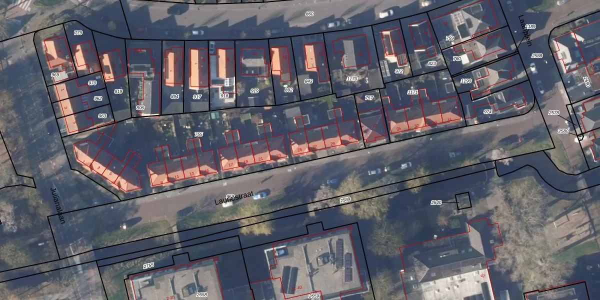 Het perceel waarop Lauriestraat 25 staat heeft een oppervlakte van 2145 m². Dit is een zeer groot perceel. De perceeloppervlakte wordt geregistreerd door het Kadaster. Gedetailleerde informatie over de maten van dit perceel kunt u vinden in het rapport Kadastrale kaart met maatvoering van Lauriestraat 25.