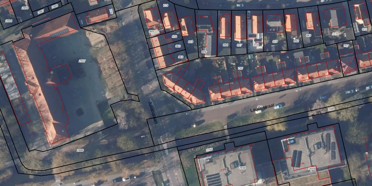 Het perceel waarop Lauriestraat 5 staat heeft een oppervlakte van 2145 m². Dit is een zeer groot perceel. De perceeloppervlakte wordt geregistreerd door het Kadaster. Gedetailleerde informatie over de maten van dit perceel kunt u vinden in het rapport Kadastrale kaart met maatvoering van Lauriestraat 5.