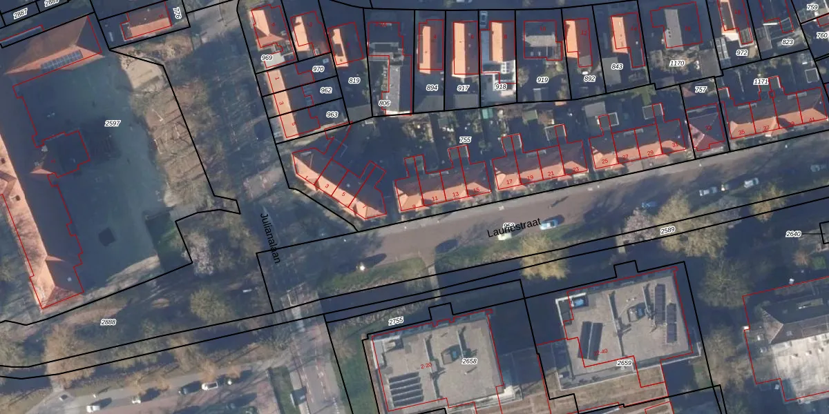 Het perceel waarop Lauriestraat 9 staat heeft een oppervlakte van 2145 m². Dit is een zeer groot perceel. De perceeloppervlakte wordt geregistreerd door het Kadaster. Gedetailleerde informatie over de maten van dit perceel kunt u vinden in het rapport Kadastrale kaart met maatvoering van Lauriestraat 9.