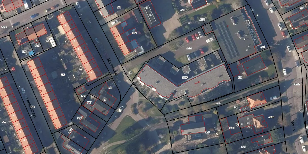 Het perceel waarop Marktstraat 100 staat heeft een oppervlakte van 1563 m². Dit is een zeer groot perceel. De perceeloppervlakte wordt geregistreerd door het Kadaster. Gedetailleerde informatie over de maten van dit perceel kunt u vinden in het rapport Kadastrale kaart met maatvoering van Marktstraat 100.