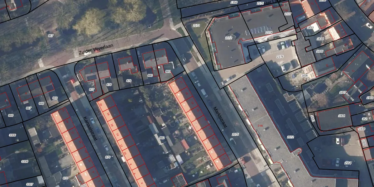 Het perceel waarop Marktstraat 15 staat heeft een oppervlakte van 3294 m². Dit is een zeer groot perceel. De perceeloppervlakte wordt geregistreerd door het Kadaster. Gedetailleerde informatie over de maten van dit perceel kunt u vinden in het rapport Kadastrale kaart met maatvoering van Marktstraat 15.