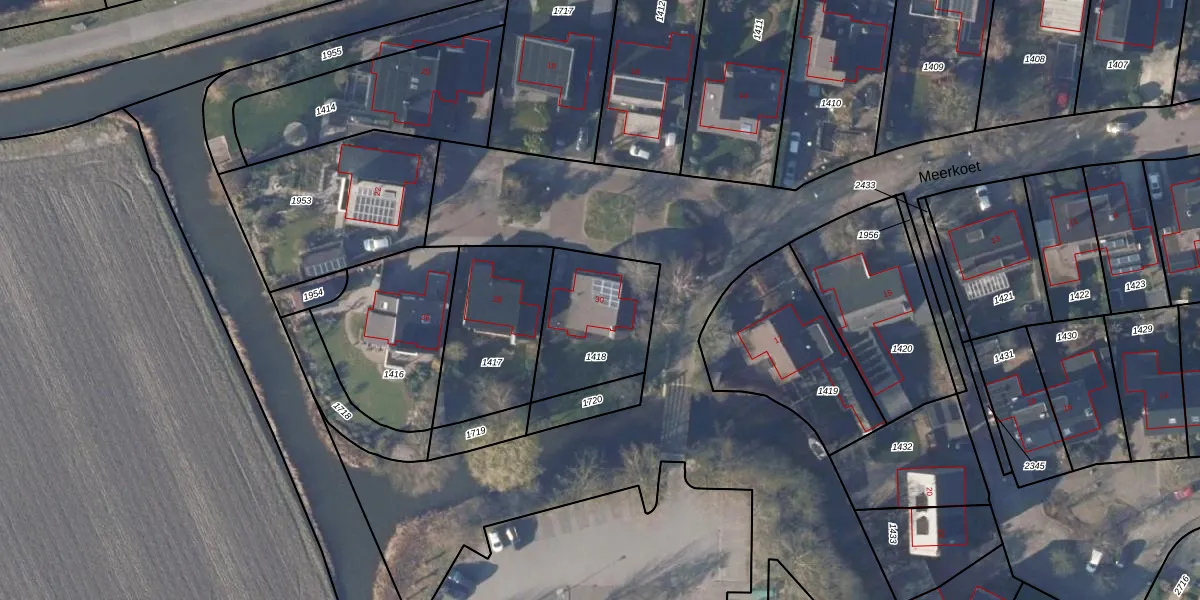 Het perceel waarop Meerkoet 30 staat heeft een oppervlakte van 400 m². Dit is een groot perceel. De perceeloppervlakte wordt geregistreerd door het Kadaster. Gedetailleerde informatie over de maten van dit perceel kunt u vinden in het rapport Kadastrale kaart met maatvoering van Meerkoet 30.