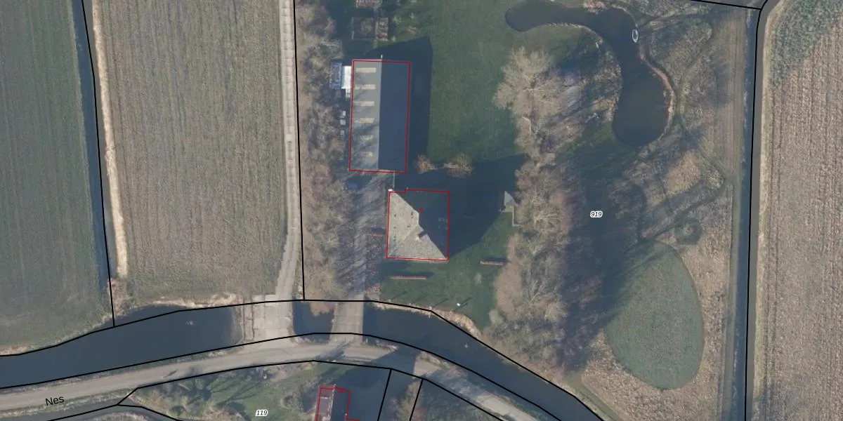 Het perceel waarop Nes 9 staat heeft een oppervlakte van 1,0 ha. Dit is een zeer groot perceel. De perceeloppervlakte wordt geregistreerd door het Kadaster. Gedetailleerde informatie over de maten van dit perceel kunt u vinden in het rapport Kadastrale kaart met maatvoering van Nes 9.