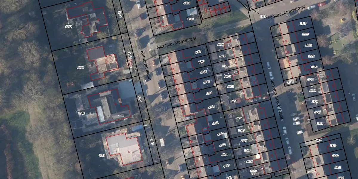 Het perceel waarop Rembrandtlaan 46 staat heeft een oppervlakte van 163 m². Dit is een middelgroot perceel. De perceeloppervlakte wordt geregistreerd door het Kadaster. Gedetailleerde informatie over de maten van dit perceel kunt u vinden in het rapport Kadastrale kaart met maatvoering van Rembrandtlaan 46.