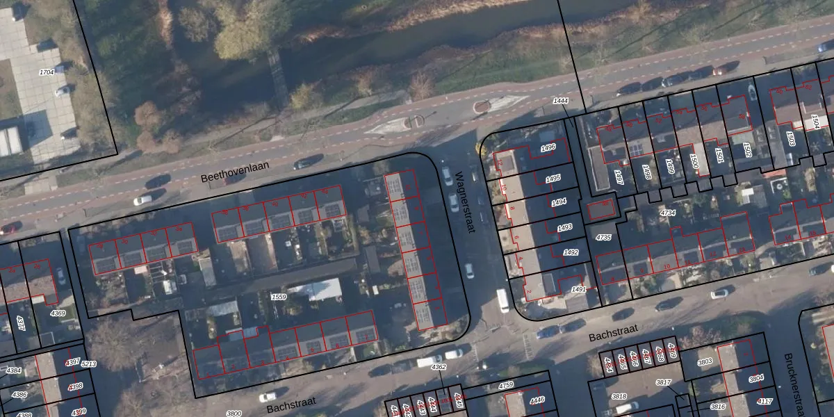 Het perceel waarop Wagnerstraat 9 staat heeft een oppervlakte van 3618 m². Dit is een zeer groot perceel. De perceeloppervlakte wordt geregistreerd door het Kadaster. Gedetailleerde informatie over de maten van dit perceel kunt u vinden in het rapport Kadastrale kaart met maatvoering van Wagnerstraat 9.