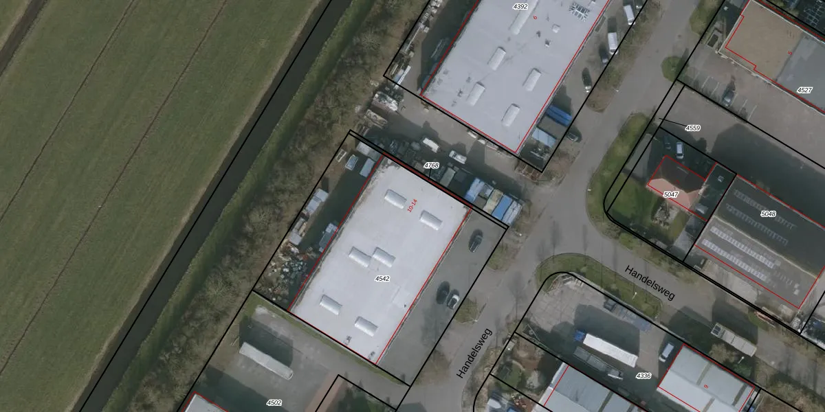 Het perceel waarop Handelsweg 10 staat heeft een oppervlakte van 2010 m². Dit is een zeer groot perceel. De perceeloppervlakte wordt geregistreerd door het Kadaster. Gedetailleerde informatie over de maten van dit perceel kunt u vinden in het rapport Kadastrale kaart met maatvoering van Handelsweg 10.