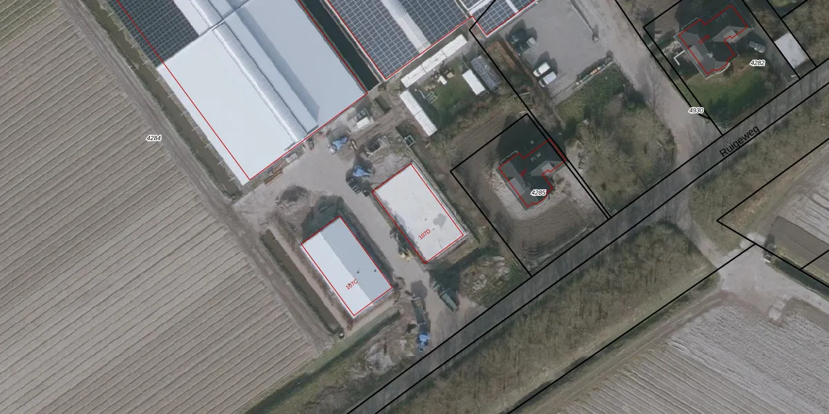 Het perceel waarop Ruigeweg 107-D staat heeft een oppervlakte van 3,2 ha. Dit is een zeer groot perceel. De perceeloppervlakte wordt geregistreerd door het Kadaster. Gedetailleerde informatie over de maten van dit perceel kunt u vinden in het rapport Kadastrale kaart met maatvoering van Ruigeweg 107-D.
