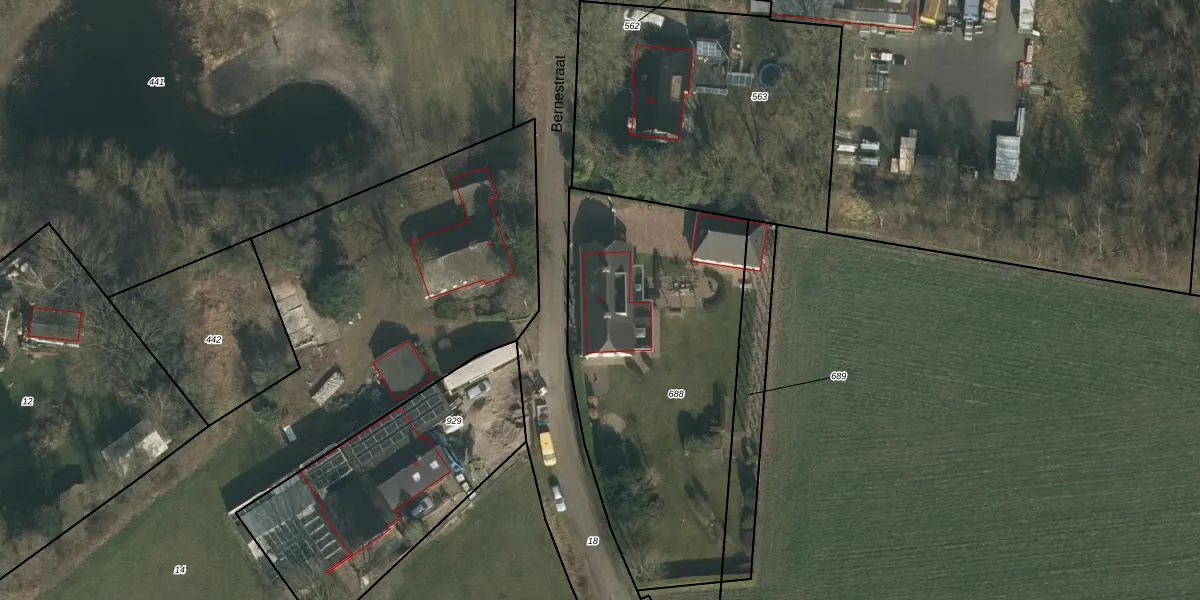Bernestraat 5 is gelegen op kadastraal perceel SCH03H688. Deze kadastrale aanduiding is uniek en wordt gebruikt door het Kadaster om eigendomsrechten en andere zakelijke rechten vast te leggen. Het perceel maakt onderdeel uit van de kadastrale gemeente Schaijk.