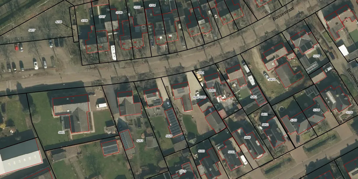 Het perceel waarop Bossestraat 53 staat heeft een oppervlakte van 820 m². Dit is een groot perceel. De perceeloppervlakte wordt geregistreerd door het Kadaster. Gedetailleerde informatie over de maten van dit perceel kunt u vinden in het rapport Kadastrale kaart met maatvoering van Bossestraat 53.
