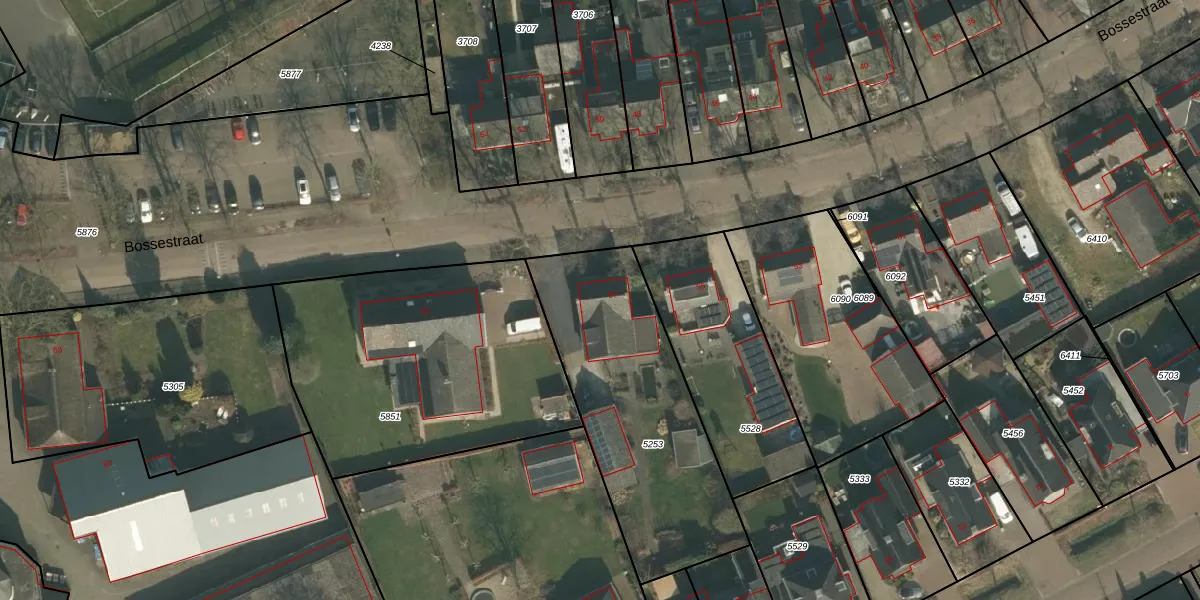 Het perceel waarop Bossestraat 57 staat heeft een oppervlakte van 1027 m². Dit is een zeer groot perceel. De perceeloppervlakte wordt geregistreerd door het Kadaster. Gedetailleerde informatie over de maten van dit perceel kunt u vinden in het rapport Kadastrale kaart met maatvoering van Bossestraat 57.