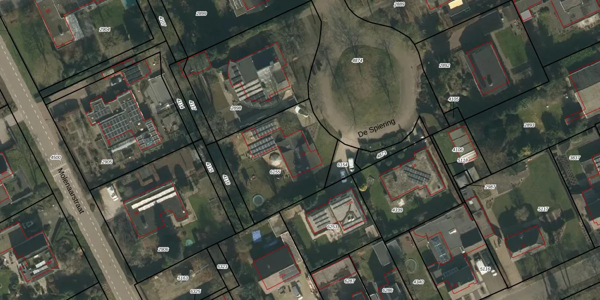 Het perceel waarop De Spiering 16 staat heeft een oppervlakte van 989 m². Dit is een groot perceel. De perceeloppervlakte wordt geregistreerd door het Kadaster. Gedetailleerde informatie over de maten van dit perceel kunt u vinden in het rapport Kadastrale kaart met maatvoering van De Spiering 16.