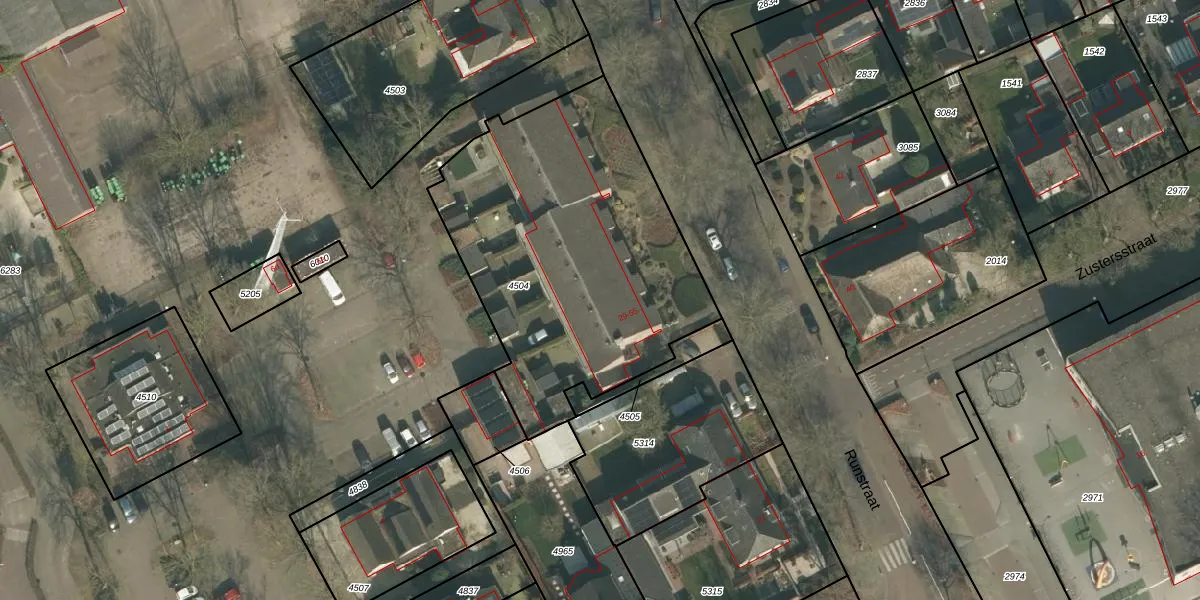 Het perceel waarop Runstraat 31 staat heeft een oppervlakte van 1645 m². Dit is een zeer groot perceel. De perceeloppervlakte wordt geregistreerd door het Kadaster. Gedetailleerde informatie over de maten van dit perceel kunt u vinden in het rapport Kadastrale kaart met maatvoering van Runstraat 31.
