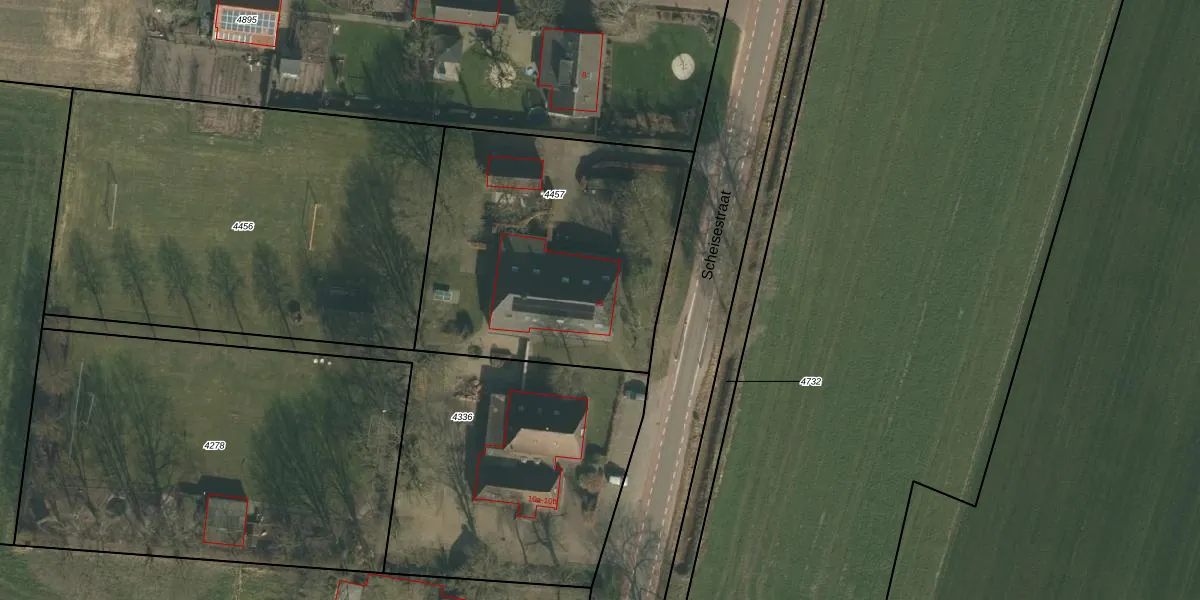 Het perceel waarop Scheisestraat 10 staat heeft een oppervlakte van 1522 m². Dit is een zeer groot perceel. De perceeloppervlakte wordt geregistreerd door het Kadaster. Gedetailleerde informatie over de maten van dit perceel kunt u vinden in het rapport Kadastrale kaart met maatvoering van Scheisestraat 10.