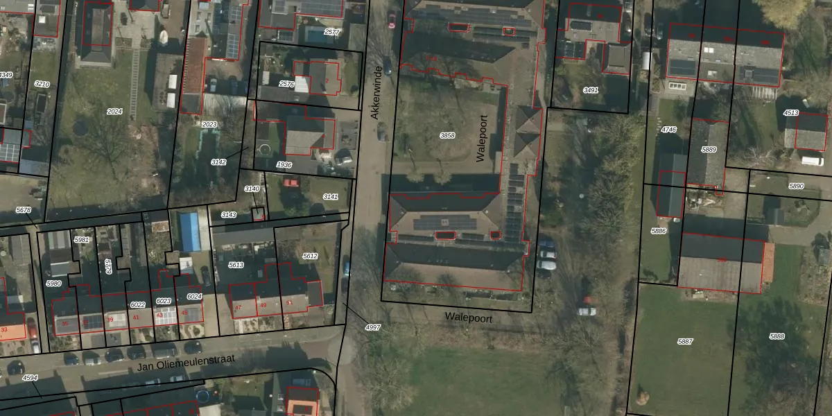 Het perceel waarop Walepoort 6 staat heeft een oppervlakte van 2985 m². Dit is een zeer groot perceel. De perceeloppervlakte wordt geregistreerd door het Kadaster. Gedetailleerde informatie over de maten van dit perceel kunt u vinden in het rapport Kadastrale kaart met maatvoering van Walepoort 6.