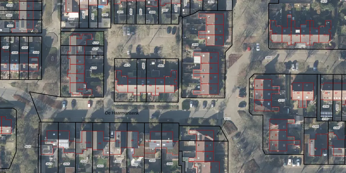Het perceel waarop De Haarmansenk 38 staat heeft een oppervlakte van 467 m². Dit is een groot perceel. De perceeloppervlakte wordt geregistreerd door het Kadaster. Gedetailleerde informatie over de maten van dit perceel kunt u vinden in het rapport Kadastrale kaart met maatvoering van De Haarmansenk 38.
