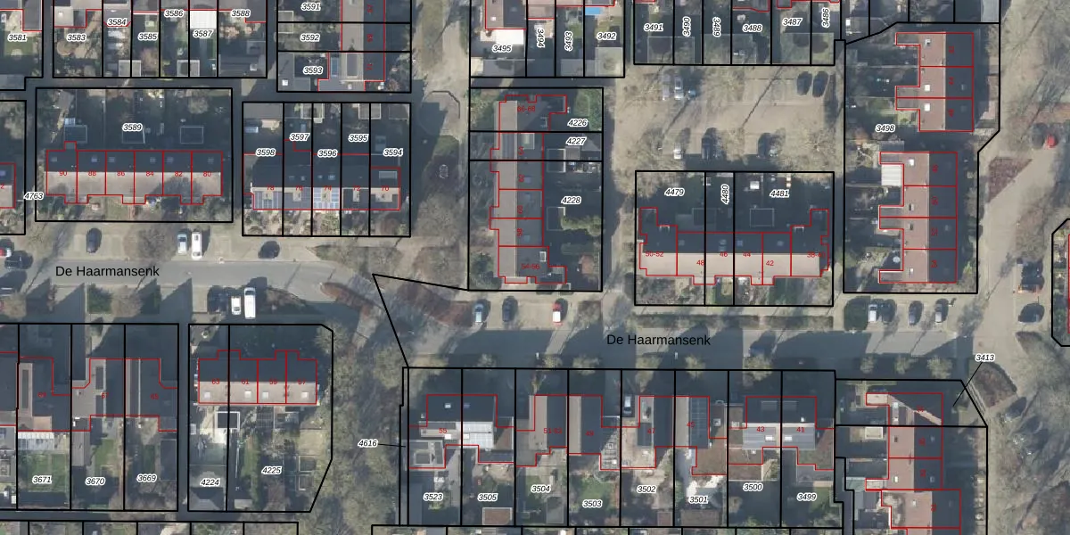 Het perceel waarop De Haarmansenk 56 staat heeft een oppervlakte van 607 m². Dit is een groot perceel. De perceeloppervlakte wordt geregistreerd door het Kadaster. Gedetailleerde informatie over de maten van dit perceel kunt u vinden in het rapport Kadastrale kaart met maatvoering van De Haarmansenk 56.