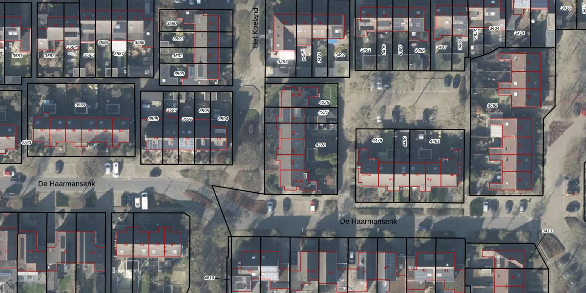 Het perceel waarop De Haarmansenk 60 staat heeft een oppervlakte van 607 m². Dit is een groot perceel. De perceeloppervlakte wordt geregistreerd door het Kadaster. Gedetailleerde informatie over de maten van dit perceel kunt u vinden in het rapport Kadastrale kaart met maatvoering van De Haarmansenk 60.