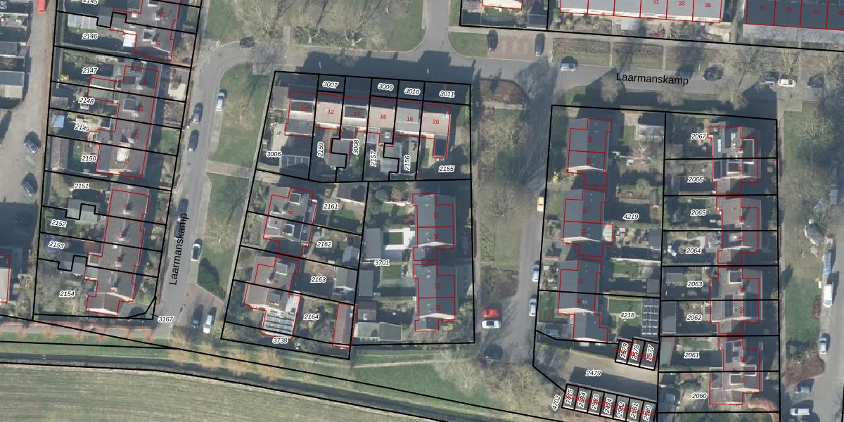 Het perceel waarop Laarmanskamp 22 staat heeft een oppervlakte van 1035 m². Dit is een zeer groot perceel. De perceeloppervlakte wordt geregistreerd door het Kadaster. Gedetailleerde informatie over de maten van dit perceel kunt u vinden in het rapport Kadastrale kaart met maatvoering van Laarmanskamp 22.