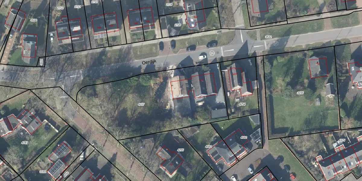 Het perceel waarop Oerdijk 102 staat heeft een oppervlakte van 2415 m². Dit is een zeer groot perceel. De perceeloppervlakte wordt geregistreerd door het Kadaster. Gedetailleerde informatie over de maten van dit perceel kunt u vinden in het rapport Kadastrale kaart met maatvoering van Oerdijk 102.