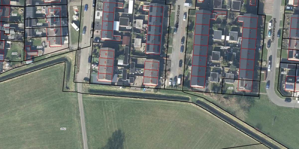 Het perceel waarop Werninkstraat 14 staat heeft een oppervlakte van 3948 m². Dit is een zeer groot perceel. De perceeloppervlakte wordt geregistreerd door het Kadaster. Gedetailleerde informatie over de maten van dit perceel kunt u vinden in het rapport Kadastrale kaart met maatvoering van Werninkstraat 14.