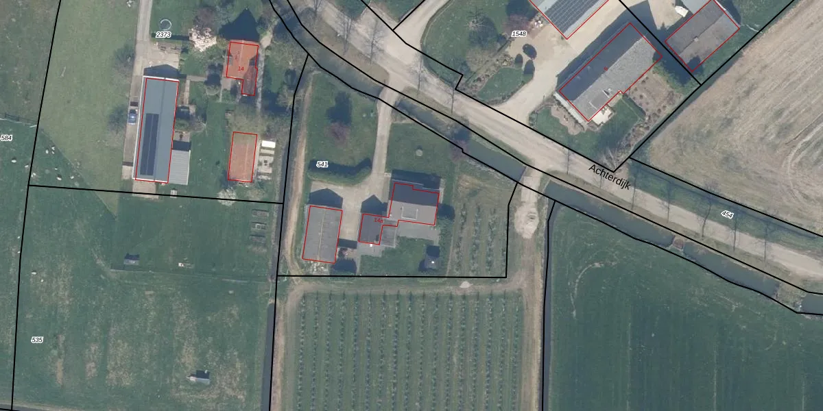 Het perceel waarop Achterdijk 14-a staat heeft een oppervlakte van 2145 m². Dit is een zeer groot perceel. De perceeloppervlakte wordt geregistreerd door het Kadaster. Gedetailleerde informatie over de maten van dit perceel kunt u vinden in het rapport Kadastrale kaart met maatvoering van Achterdijk 14-a.