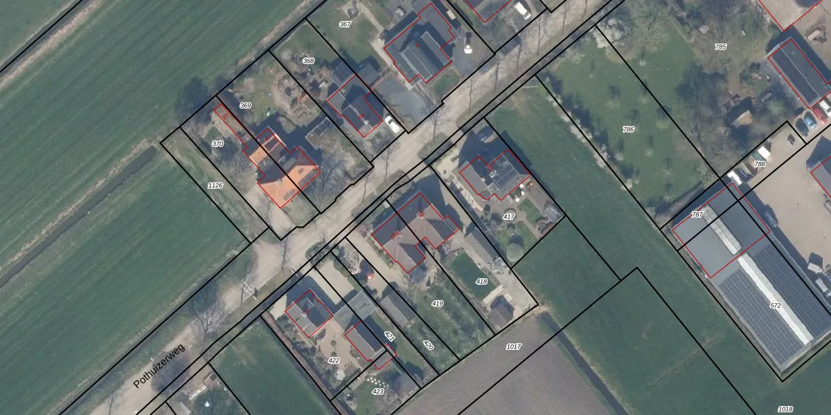 Pothuizerweg 15 is gelegen op kadastraal perceel HTN04K418. Deze kadastrale aanduiding is uniek en wordt gebruikt door het Kadaster om eigendomsrechten en andere zakelijke rechten vast te leggen. Het perceel maakt onderdeel uit van de kadastrale gemeente Houten.