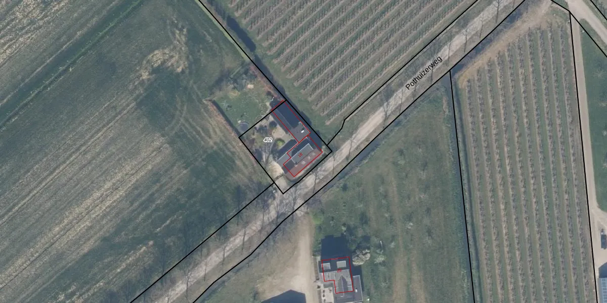 Pothuizerweg 18 is gelegen op kadastraal perceel HTN04K402. Deze kadastrale aanduiding is uniek en wordt gebruikt door het Kadaster om eigendomsrechten en andere zakelijke rechten vast te leggen. Het perceel maakt onderdeel uit van de kadastrale gemeente Houten.