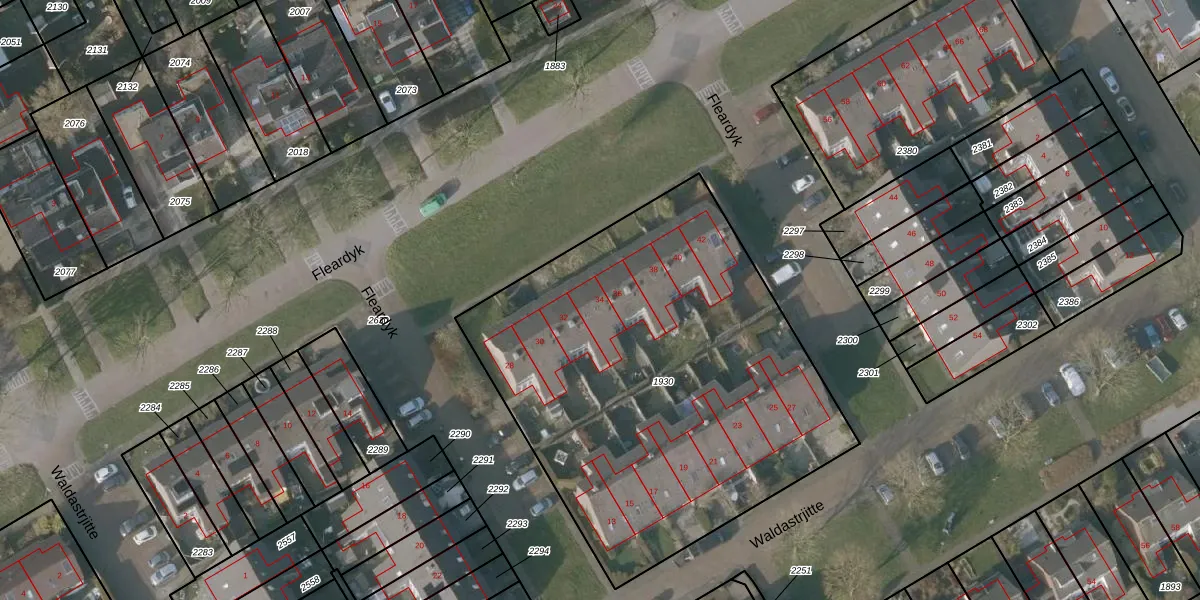 Het perceel waarop Fleardyk 34 staat heeft een oppervlakte van 2488 m². Dit is een zeer groot perceel. De perceeloppervlakte wordt geregistreerd door het Kadaster. Gedetailleerde informatie over de maten van dit perceel kunt u vinden in het rapport Kadastrale kaart met maatvoering van Fleardyk 34.