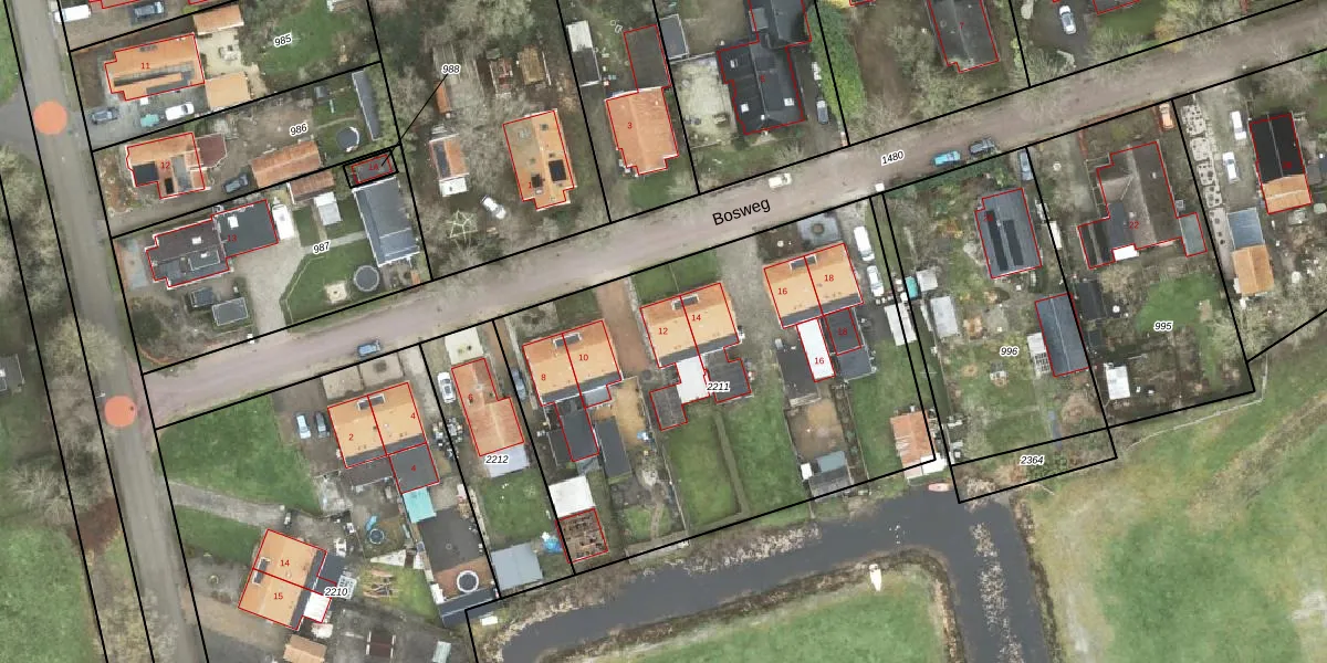 Het perceel waarop Bosweg 12 staat heeft een oppervlakte van 2375 m². Dit is een zeer groot perceel. De perceeloppervlakte wordt geregistreerd door het Kadaster. Gedetailleerde informatie over de maten van dit perceel kunt u vinden in het rapport Kadastrale kaart met maatvoering van Bosweg 12.
