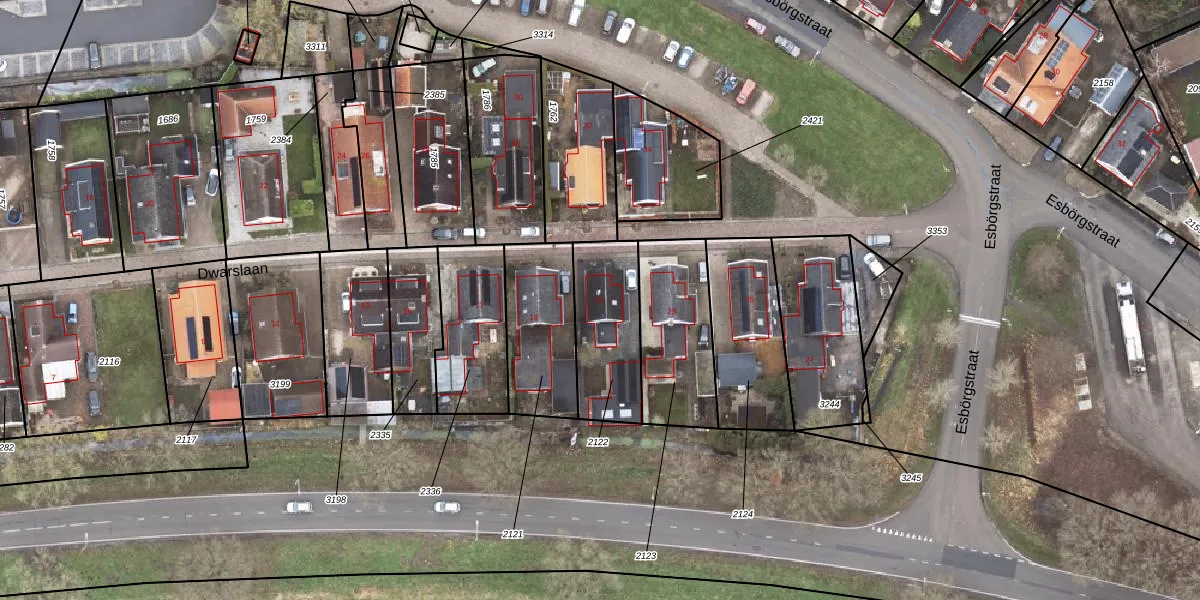 Dwarslaan 21 is gelegen op kadastraal perceel SDA00F2122. Deze kadastrale aanduiding is uniek en wordt gebruikt door het Kadaster om eigendomsrechten en andere zakelijke rechten vast te leggen. Het perceel maakt onderdeel uit van de kadastrale gemeente Scheemda.
