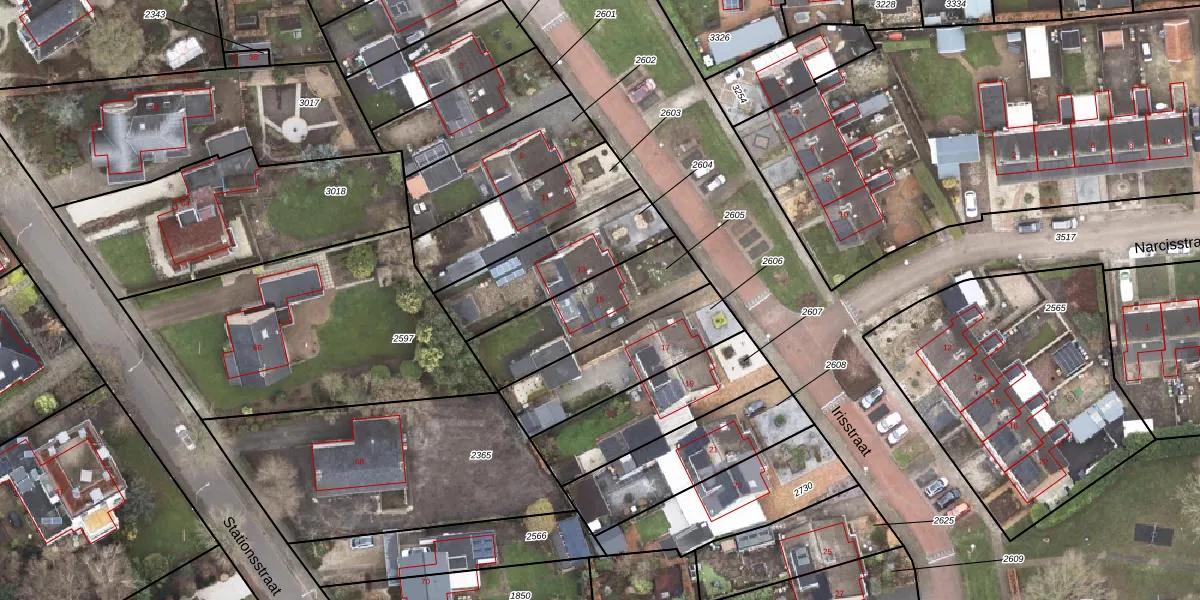 Irisstraat 15 is gelegen op kadastraal perceel SDA00F2605. Deze kadastrale aanduiding is uniek en wordt gebruikt door het Kadaster om eigendomsrechten en andere zakelijke rechten vast te leggen. Het perceel maakt onderdeel uit van de kadastrale gemeente Scheemda.